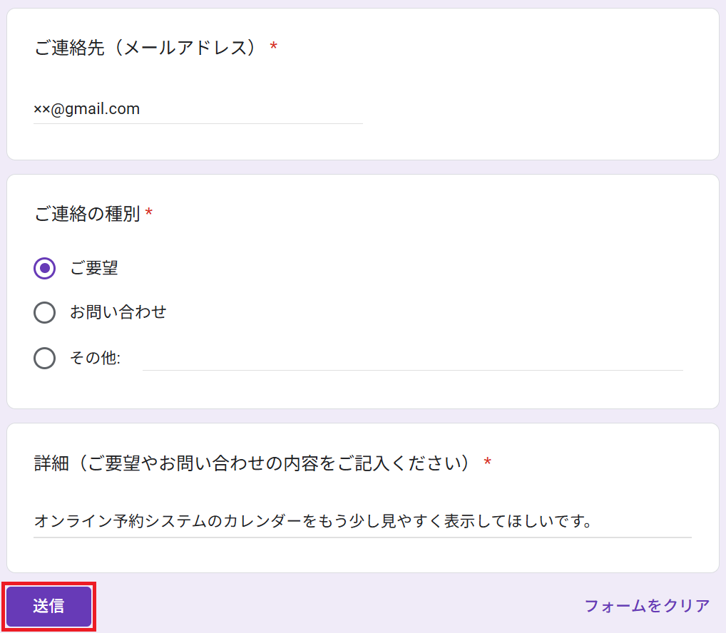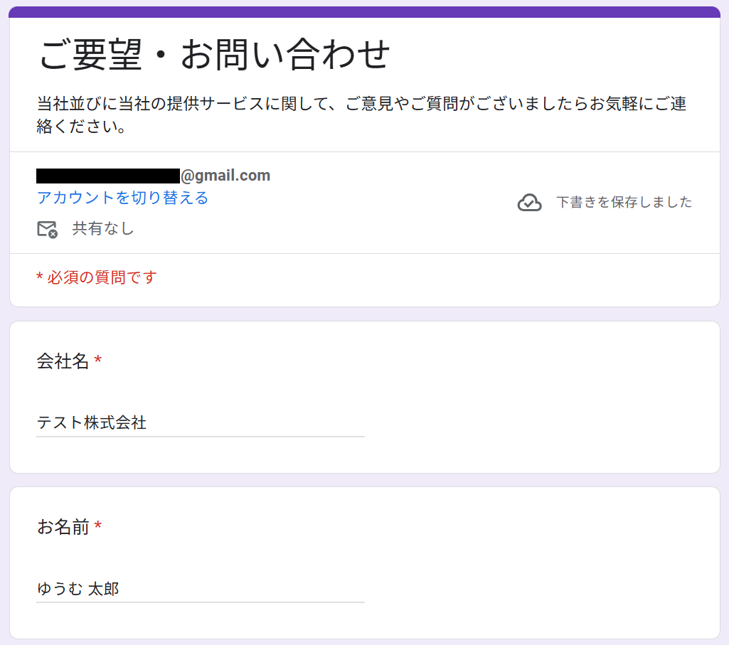 まず準備として、フォームを作成して回答したものをご用意ください。今回は以下のようなフォームを作り、自分で回答してみました。