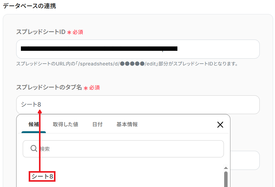 次に、先ほど用意したシートの「スプレッドシートID」と「スプレッドシートのタブ名」を候補から選択します。任意でテーブル範囲を選択して「次へ」をクリックしてください。
