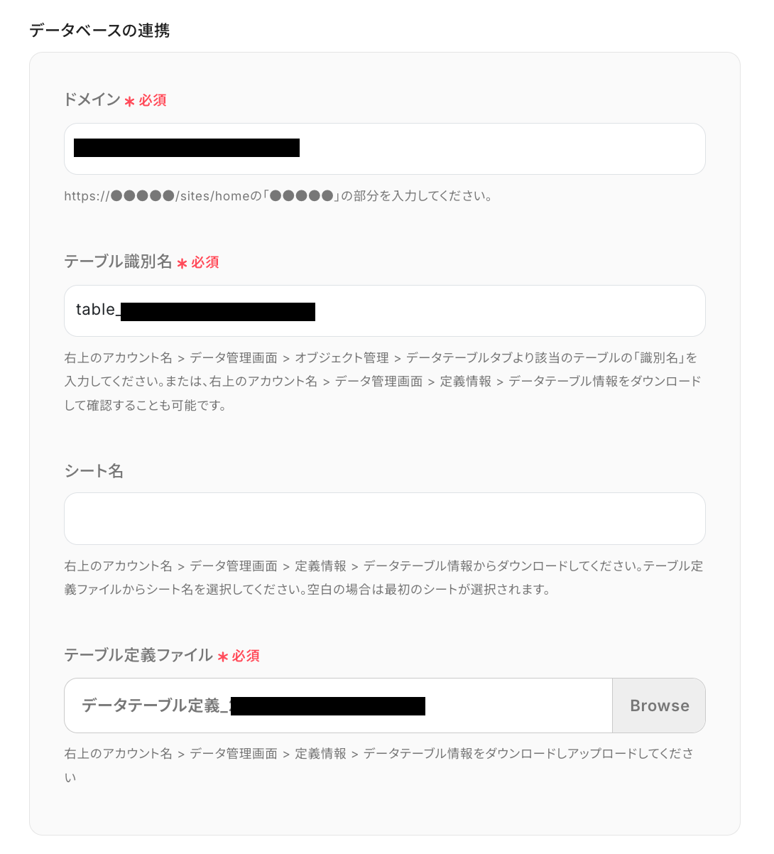 JUST.DB上で「ドメイン」「テーブル識別名」「テーブル定義ファイル」を確認して、手動で設定しましょう。