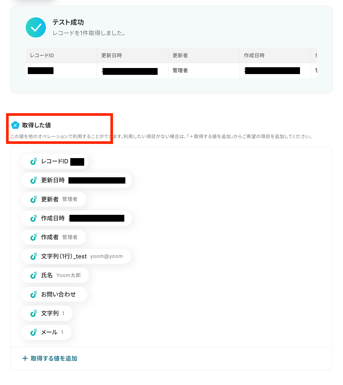 テスト成功で、取得した値にレコード情報が取得されています。