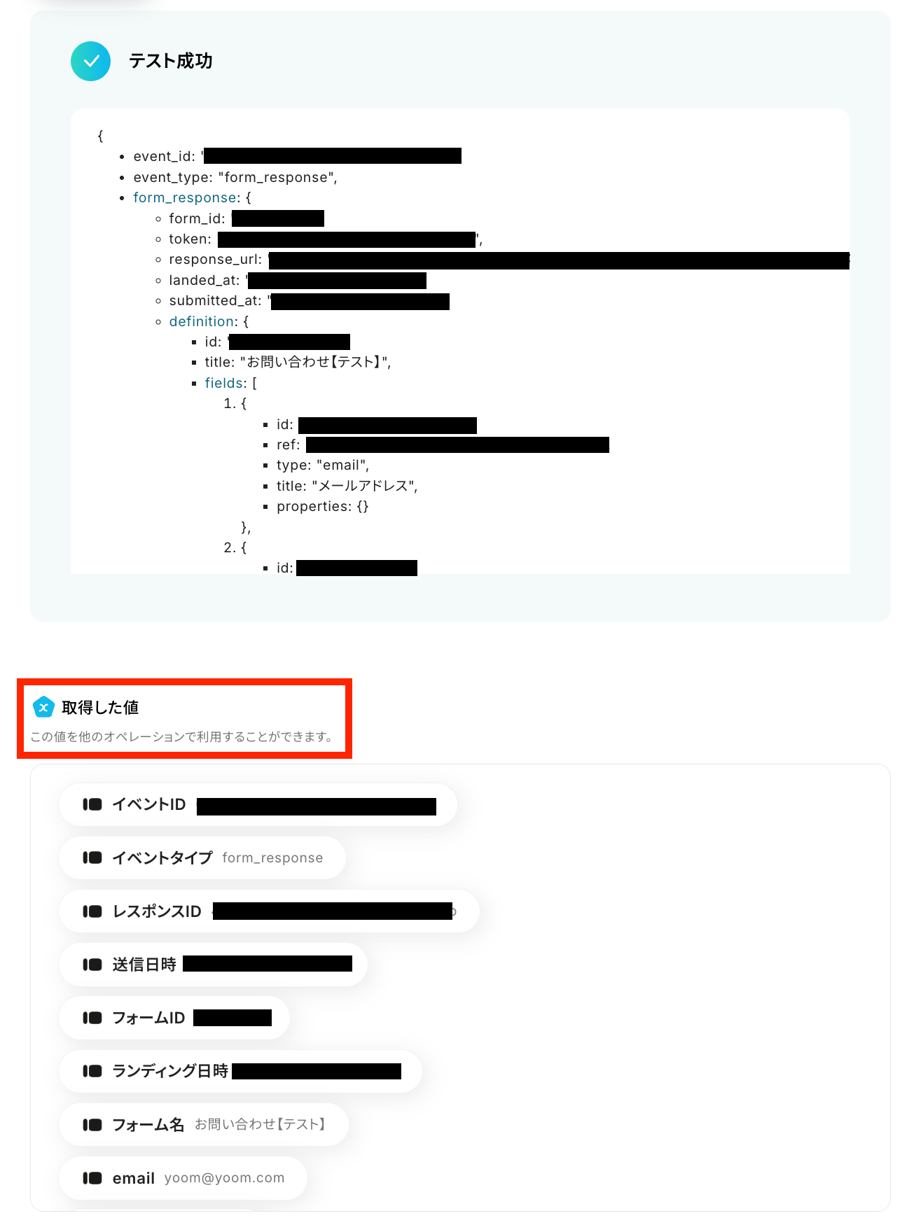 トリガーやオペレーション設定時に、「テスト」を実行して取得した値のことを指します。