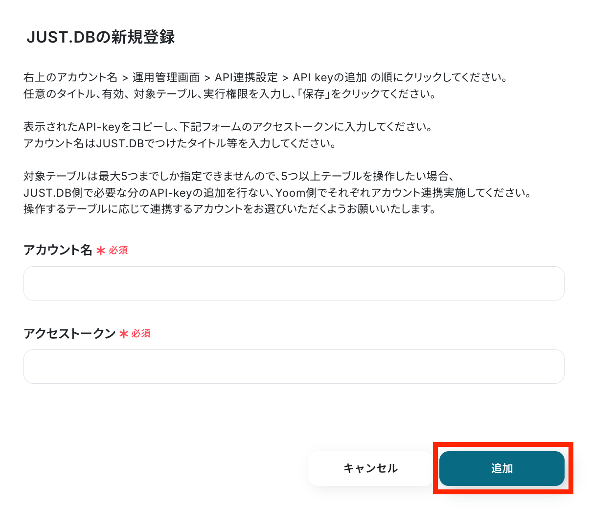 任意のアカウント名とアクセストークンを記入して、「追加」ボタンをクリックします。