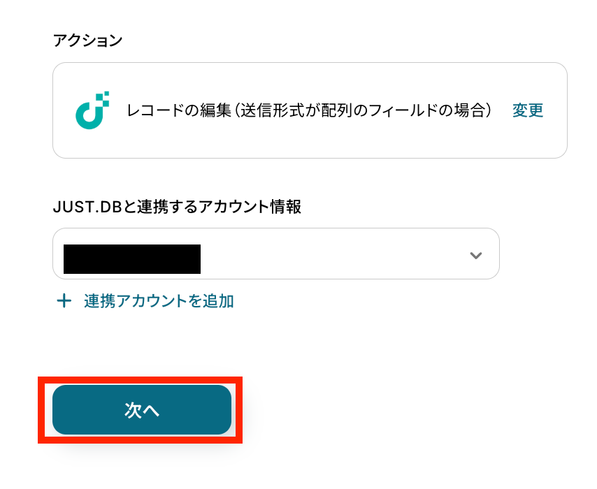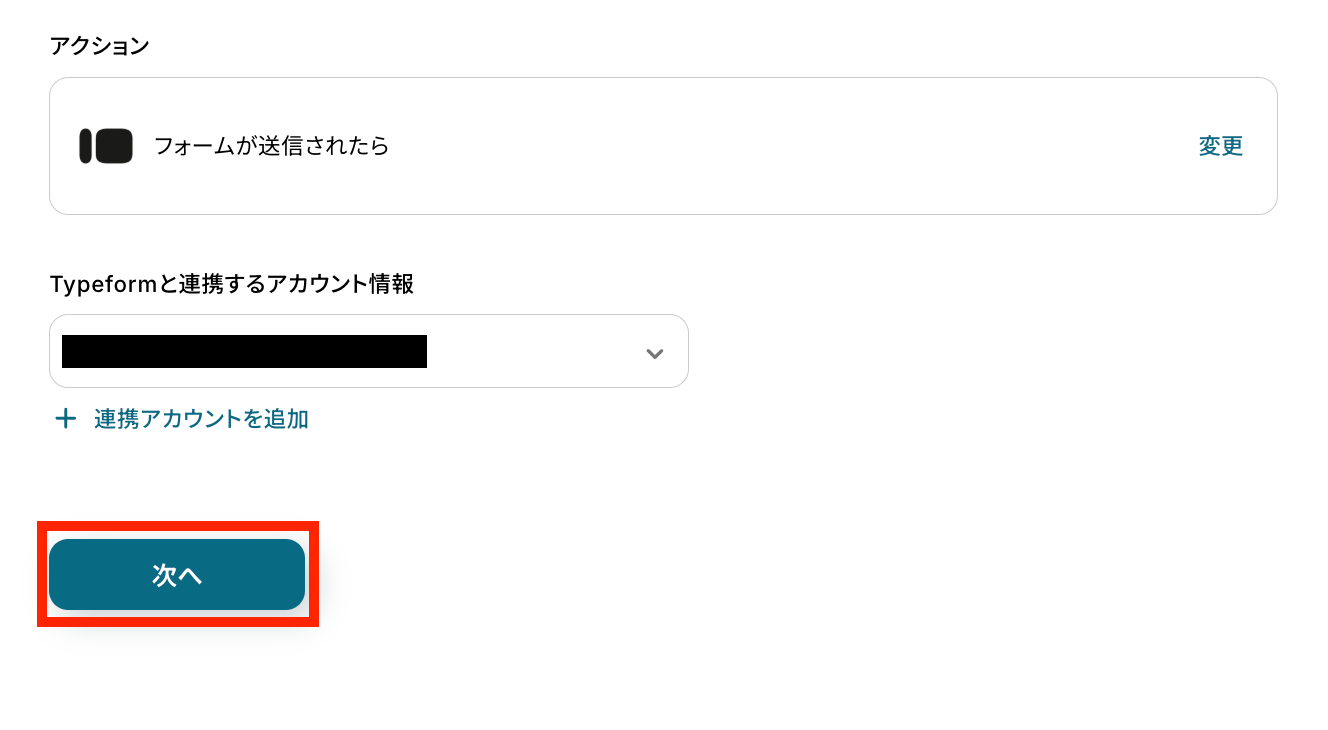 アクションはテンプレートのままで、連携するアカウント情報を確認します。