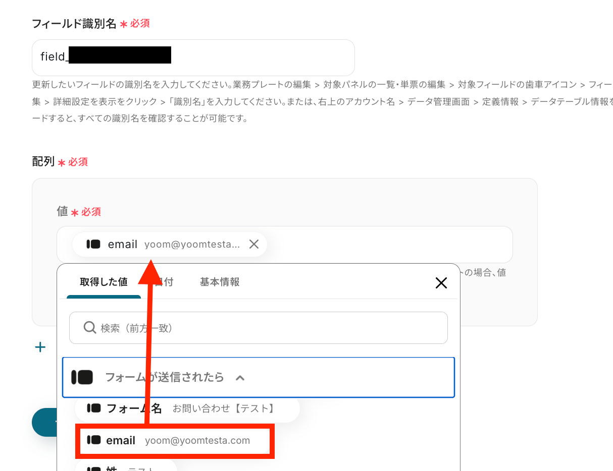 フィールド識別名はJUST.DB上で確認して記入し、配列は取得した値から選択して設定しましょう。