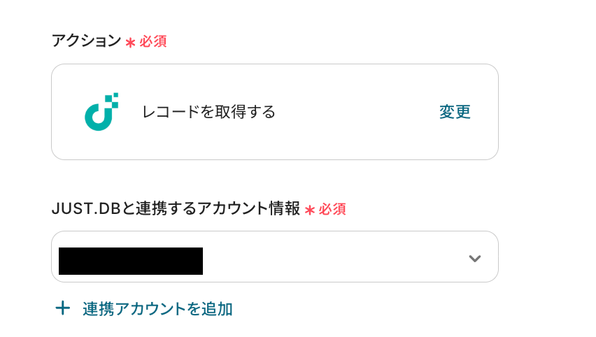 JUST.DBのレコードを取得する設定を行っていきます。以下の赤枠をクリックしてください。