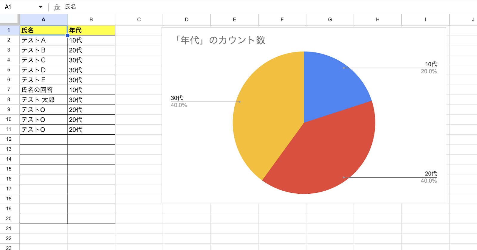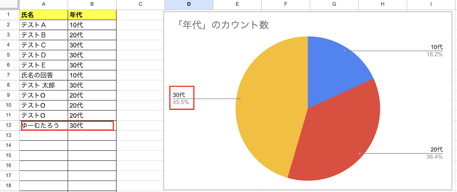 今回は以下のGoogle スプレッドシートを用意しました。 フォームの回答から年代のグラフを更新するという想定で設定していきます。
