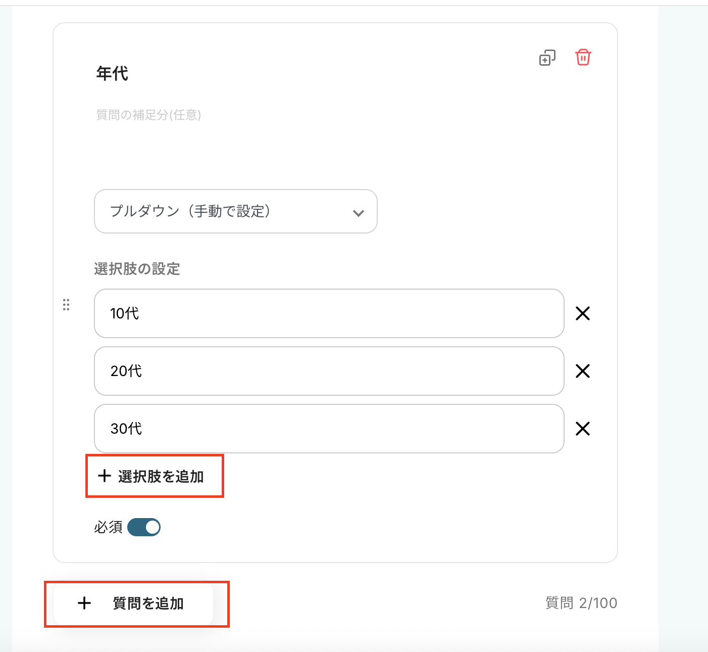 以下のように氏名と年代を回答するフォームを設定しました。 「選択肢を追加」や「質問を追加」から項目を増やすことが可能です。 設定後、次へをクリックしましょう。