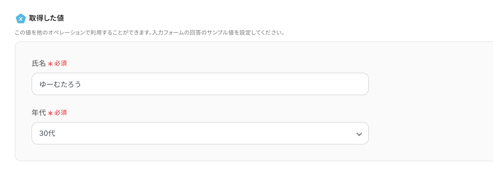 フォームの回答のサンプル値を設定しましょう。 ここで入力した値を次のアクション設定で使用します。 設定したら、保存しましょう。