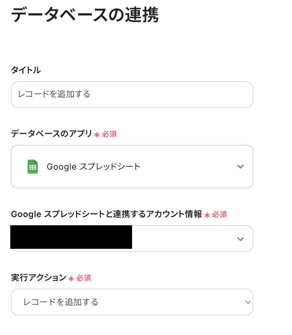 タイトルは変更できます。 Google スプレッドシートと連携するアカウント情報を確認しましょう。 実行アクションは「レコードを追加する」が選択されています。