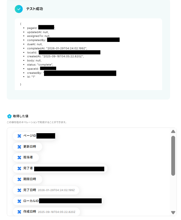 上記の設定が完了したらテストボタンをクリックしてください。 テストが成功すると、取得した値が入ります。 ※取得した値 とは? トリガーやオペレーション設定時に、「テスト」を実行して取得した値のことを指します。 後続のオペレーション設定時の値として利用でき、フローボットを起動する度に変動した値となります。