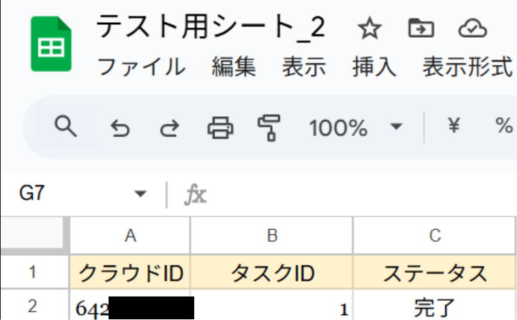 ここでトリガーとして感知させるため、クラウドIDとタスクIDを入力した以下のようなGoogle スプレッドシートを作成しておきます。