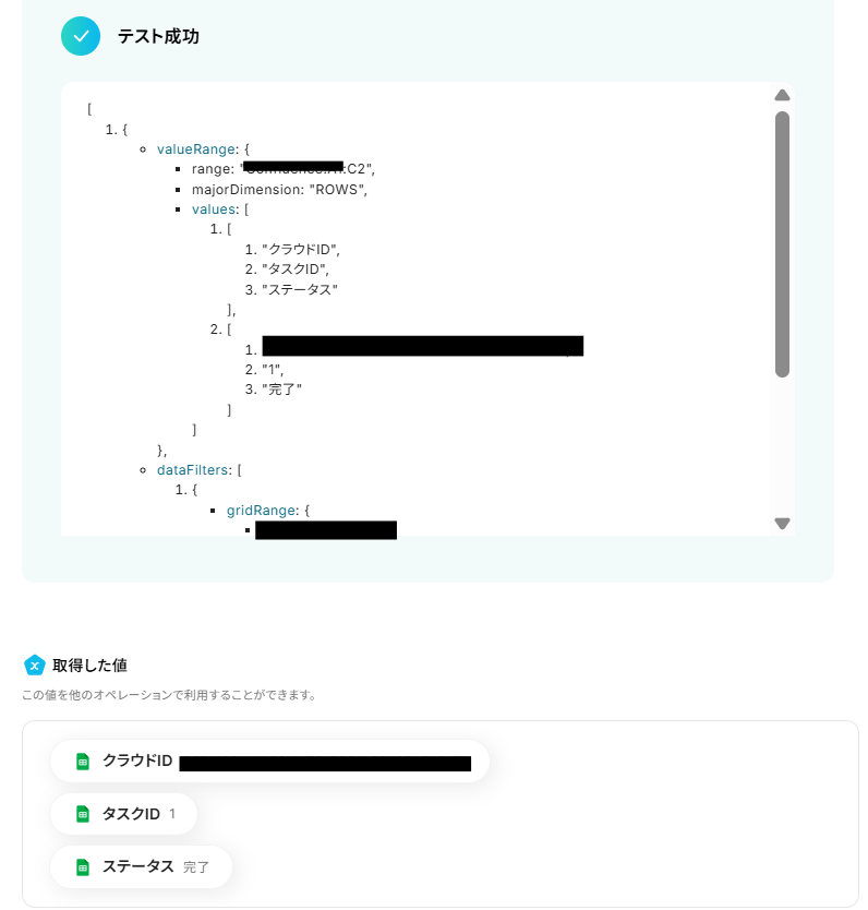 ここまで設定したらテストボタンをクリックしてください。 テストが成功すると、取得した値が入ります。