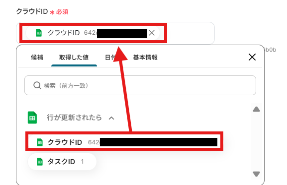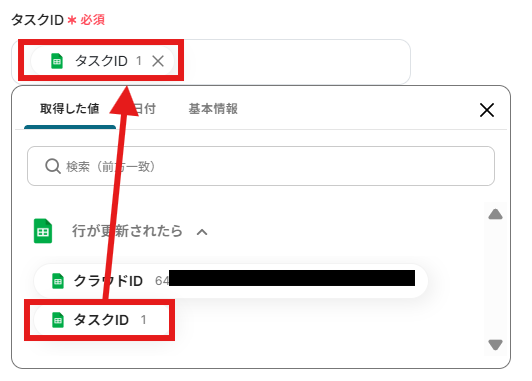 クラウドID、タスクIDを取得した値から入力してください。 取得した値を活用することで、固定値ではなく、トリガーが実行されるたびに最新の情報が反映できます。