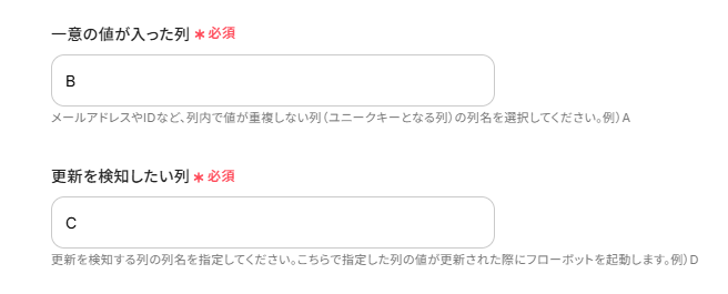 「一意の値が入った列 」は他と重複しない値が入った列としてB 「更新を検知したい列」はCとしています。