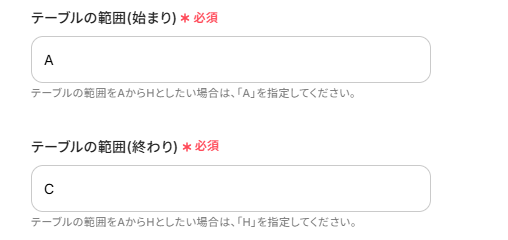 「テーブル範囲の始まり・終わり」はGoogle スプレッドシート上で値が入っている範囲を指定します。