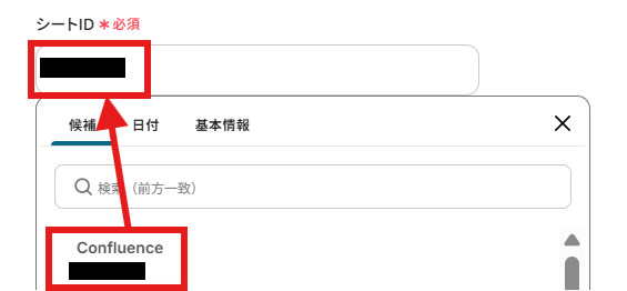 上記で作成した「スプレッドシートID」「シートID」を候補から入力していきます。