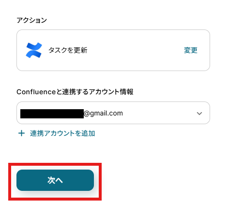 アクションはデフォルト設定のまま、アカウント情報は、連携したいアカウントが選択されているか確認してください。確認が終わったら「次へ」で進みましょう。