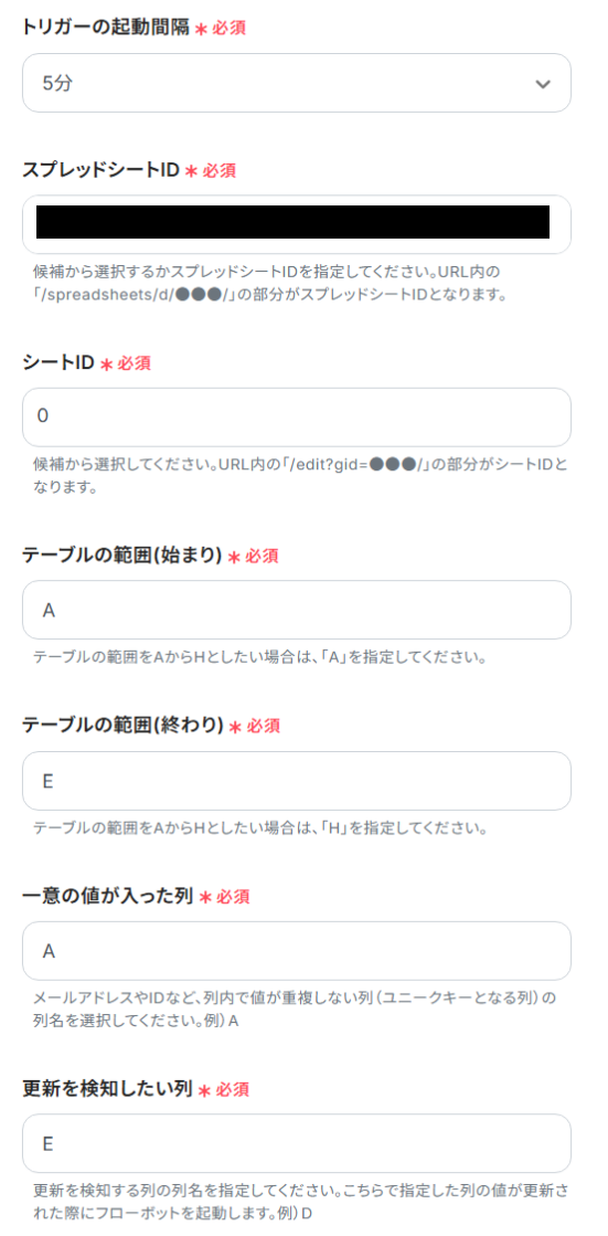 シートID:スプレッドシートIDと同様に、入力欄をクリックして対象のシート名を選択しましょう。