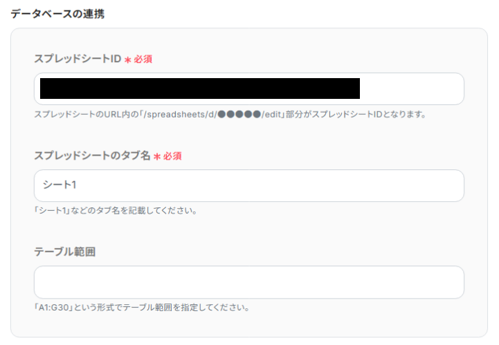 テーブルの範囲(始まり)、テーブルの範囲(終わり):Google スプレッドシートの対象となる範囲を英字で設定してください。