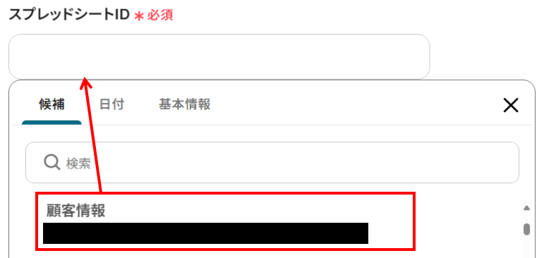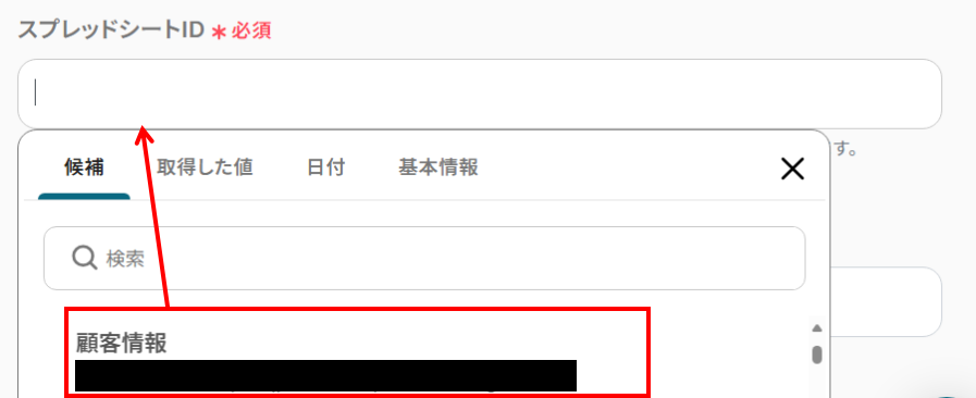 スプレッドシートID:入力欄をクリックして、対象のGoogle スプレッドシートを選択しましょう。