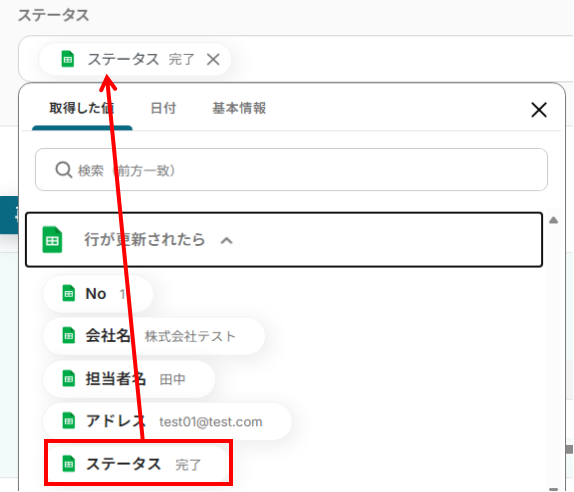 今回は、「ステータス」を完了にしたいため、前のステップで取得した値を下記の通り入力しました。