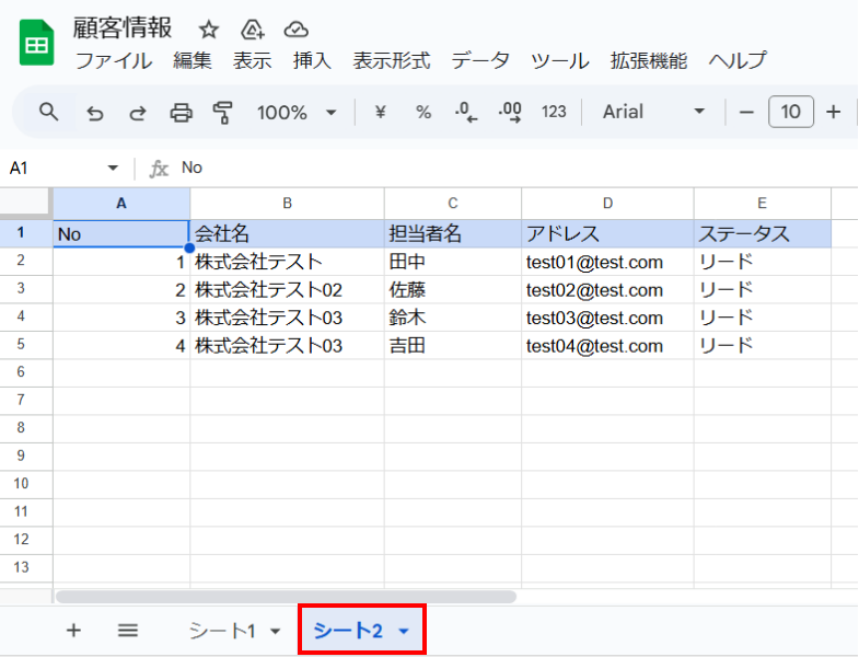 2.ここでは、前のステップでトリガーとしたシートとは別のシートのレコードを更新するため、具体的な設定をしていきます。 今回は、下記赤枠のようなシートを作成しました。ステータスはまだ更新されていない状態なので、こちらを更新するよう設定して行きたいと思います!
