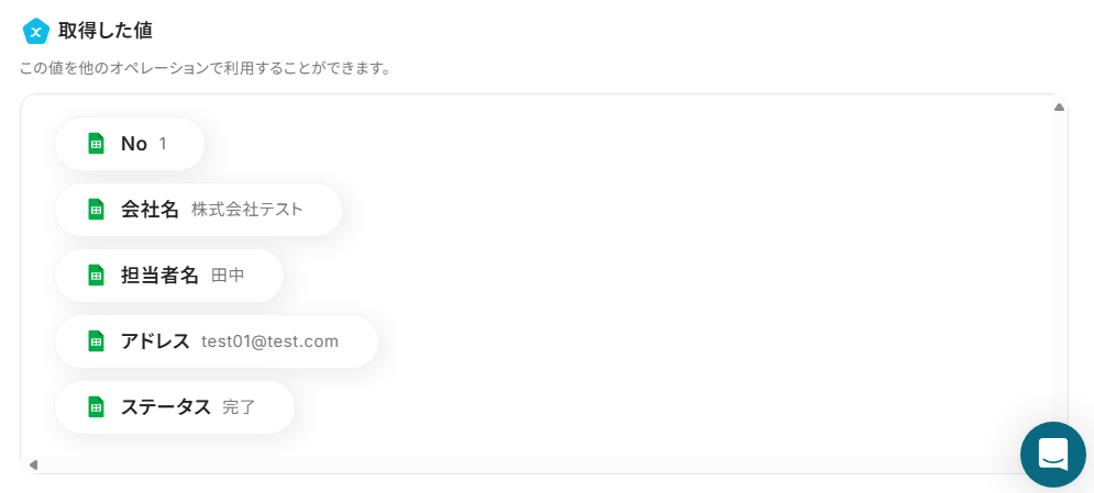 入力が完了したら、「テスト」を実行し、成功するか確認してみましょう。 下記のような、Google スプレッドシートのデータが反映したアウトプットが表示されればOKです! 最後に、「保存する」を押して次のステップへ進みましょう。