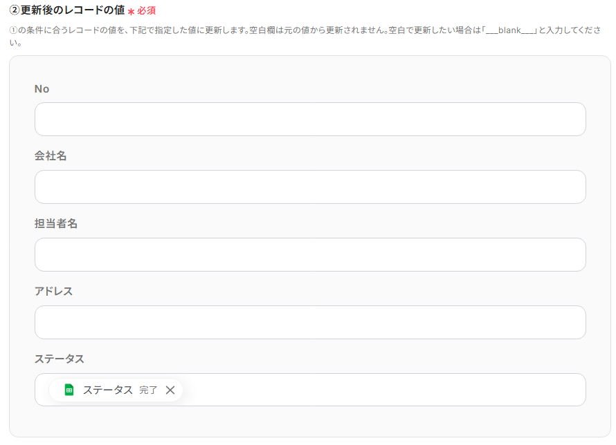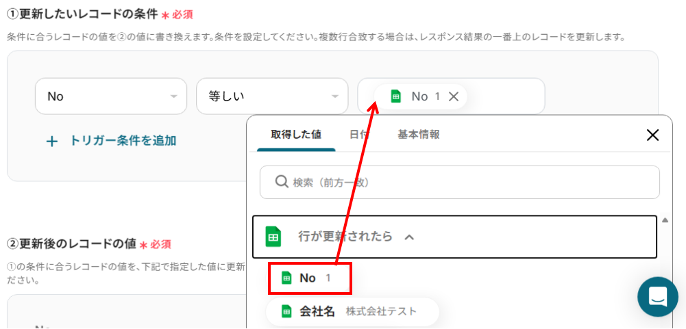 次に、「更新後のレコードの値」を設定しましょう。 こちらも、入力欄をクリックすることでアウトプットが表示されるので、更新したいレコードの値を入力してください。
