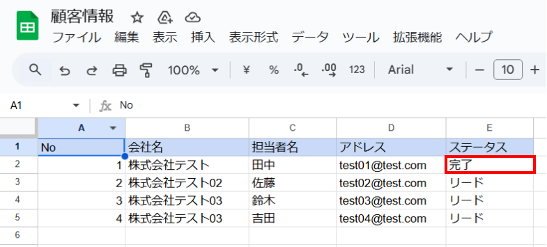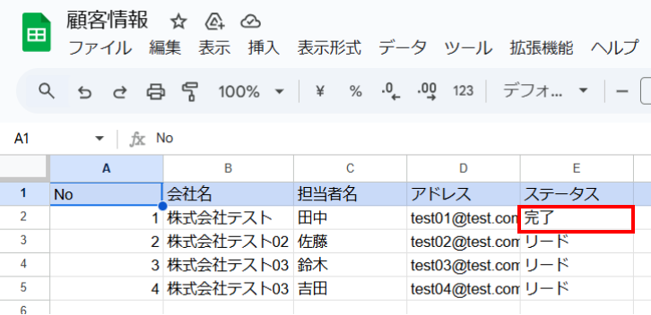 入力が完了したら「テスト」を実行し、下記赤枠のように指定したGoogle スプレッドシートのレコードが更新されていればOKです! 最後に、「保存する」を押して次のステップへ進みましょう。