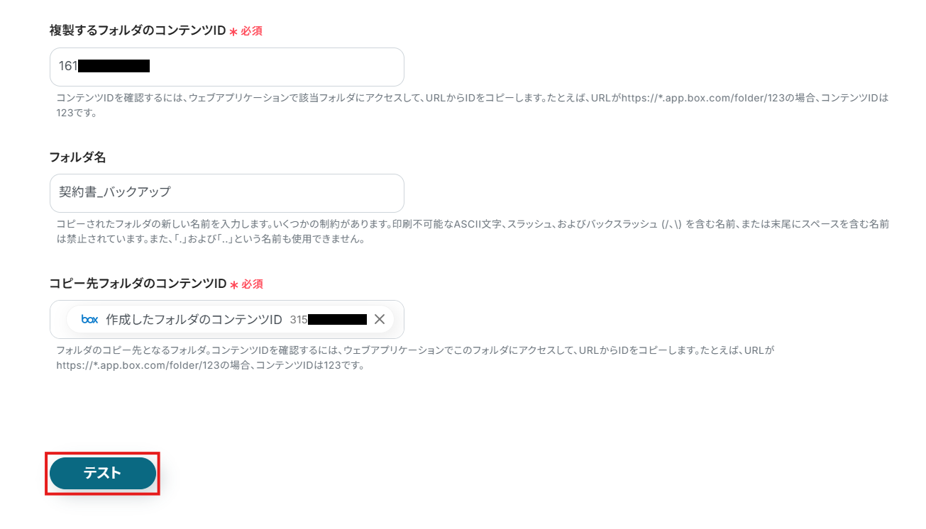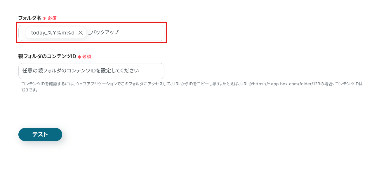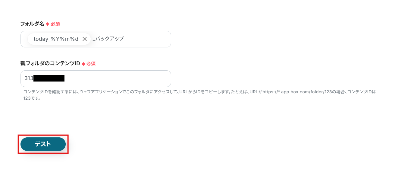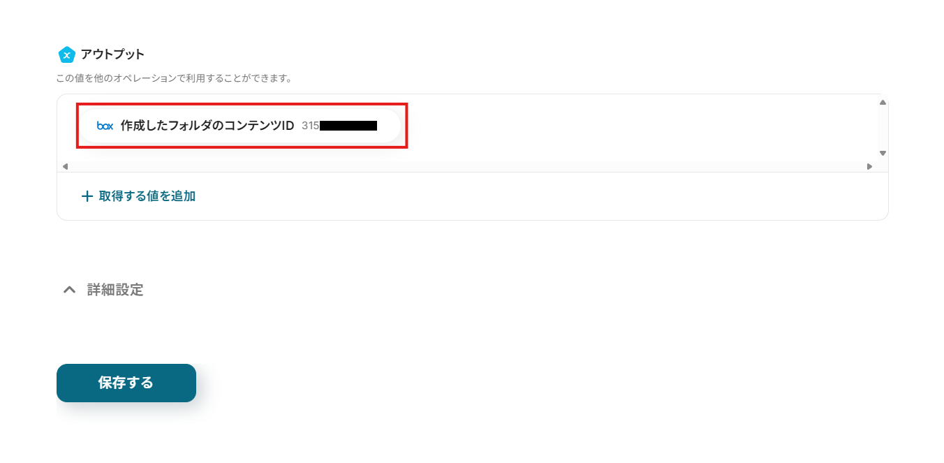 テストが成功すると、Boxに新しいフォルダが作成され、「アウトプット」に作成したフォルダのコンテンツIDが追加されます。