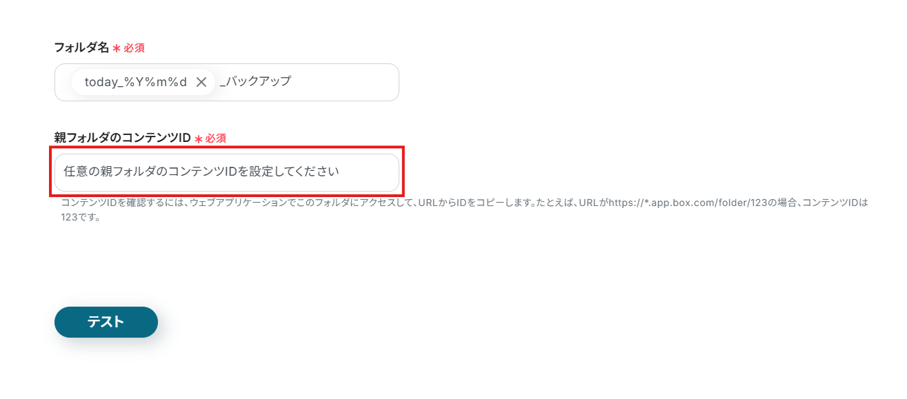 コンテンツIDはBoxのフォルダのURL(app.box.com/folder/<ID部分>)で確認できます。