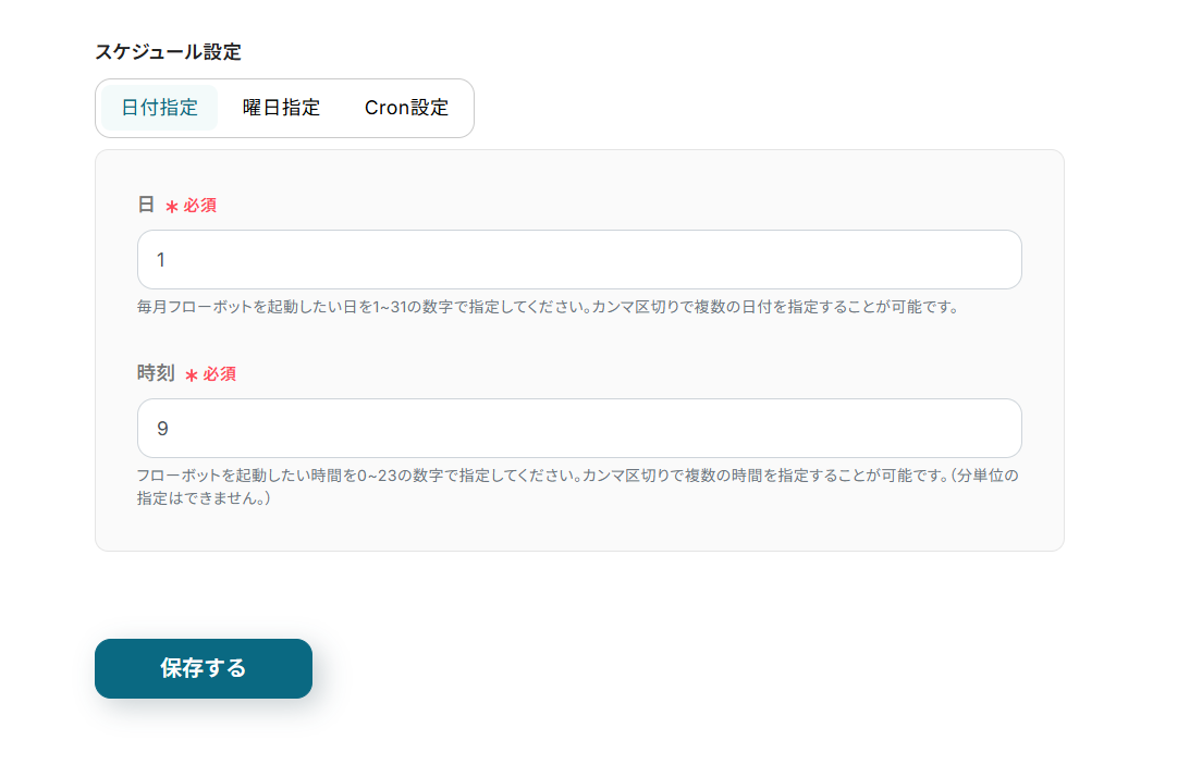 - スケジュール設定の「日」と「時刻」に任意の値を設定。