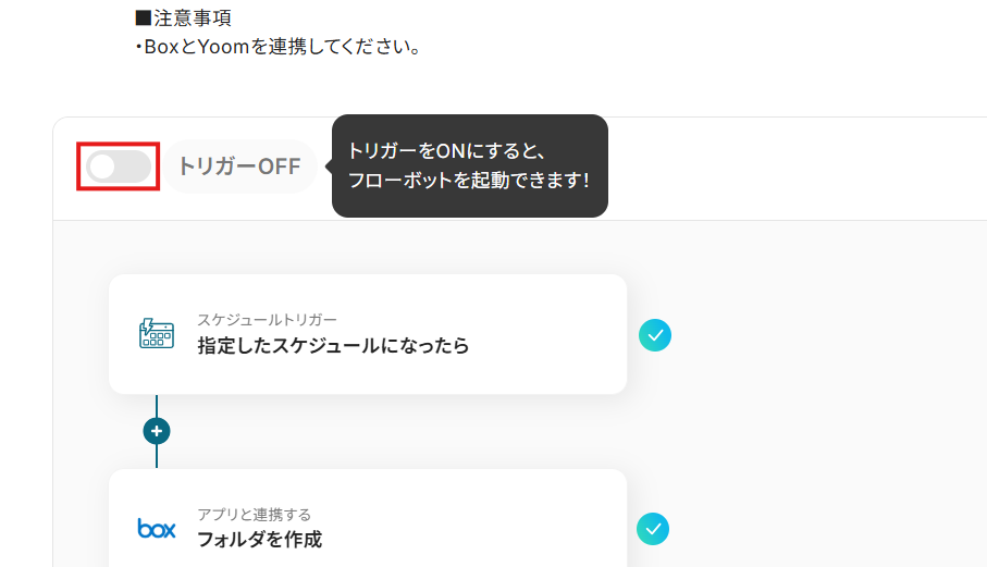 あとで稼働させる場合は、フロー画面のトリガースイッチをクリックすることで、トリガーをONにできます。