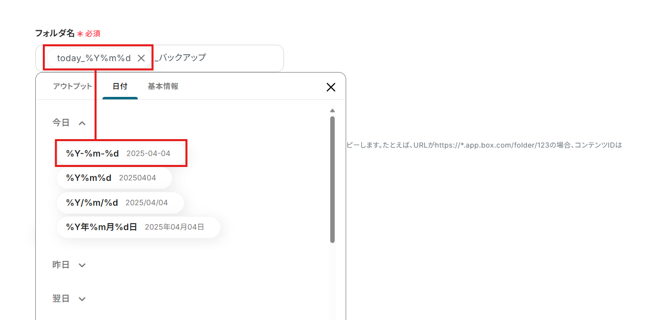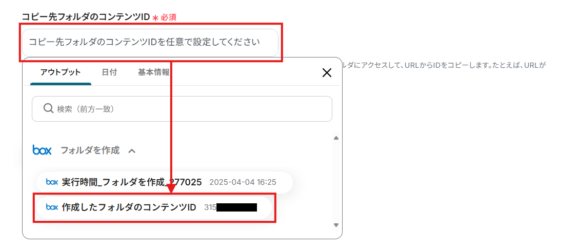 入力欄クリック時に表示されるメニューから「フォルダを作成」→「作成したフォルダのコンテンツID」を選択し、ステップ3で取得したアウトプットを利用しましょう。