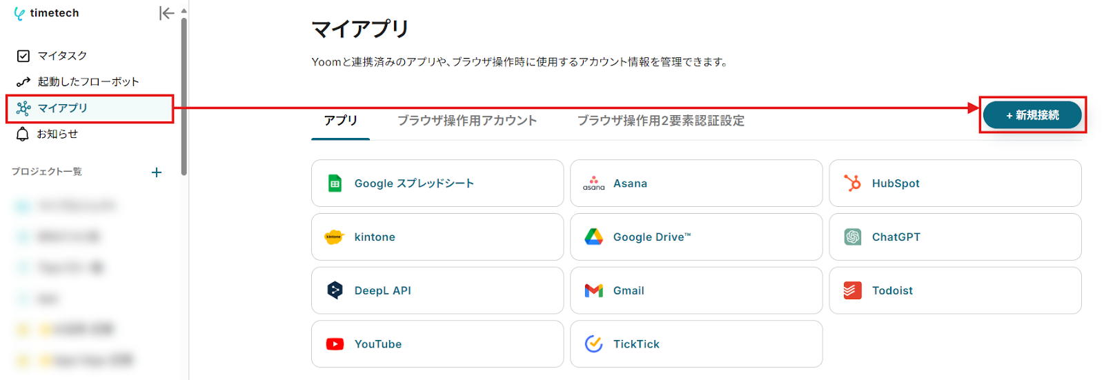 - マイアプリ画面の右側にある「+新規接続」をクリック。
