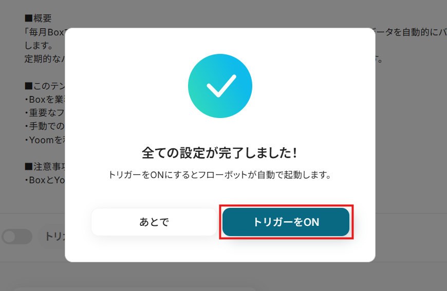 「毎月Boxで指定のフォルダのバックアップを作成する」ワークフローは、Box上の重要なデータを自動的にバックアップすることで、データ管理の手間を軽減します。