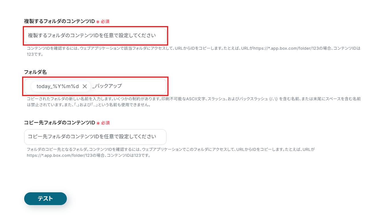 - 「コピー先フォルダのコンテンツID」に、ステップ3で作成したフォルダのコンテンツIDを設定。