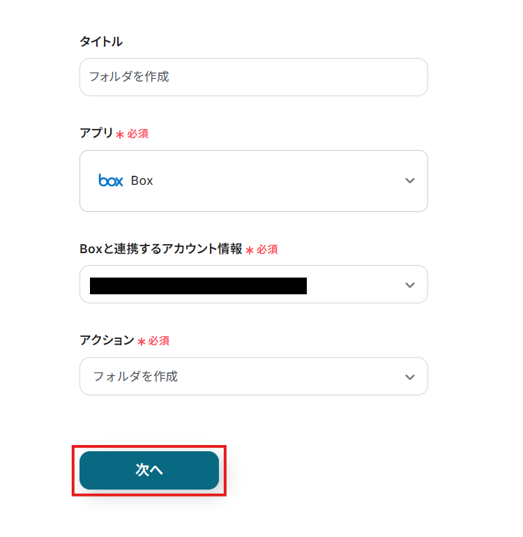 - 連携アカウントとアクションの内容を確認し、「次へ」をクリック。
