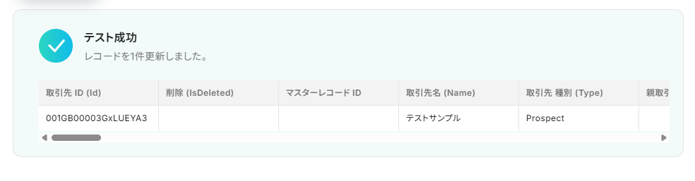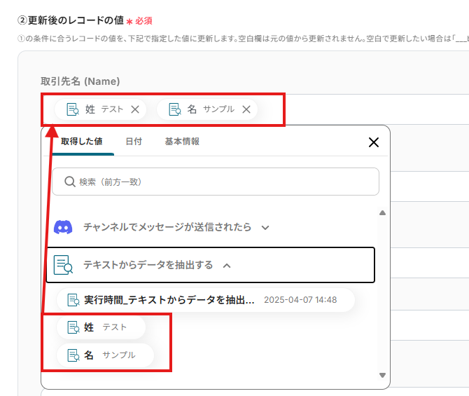 「更新後のレコードの値」の「取引先名 (Name)」は、入力欄をクリックして表示されるアウトプット(取得した値)から選択してください。