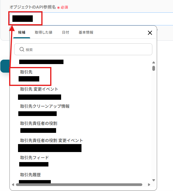 「オブジェクトのAPI参照名」は、入力欄をクリックして表示される候補から選択してください。