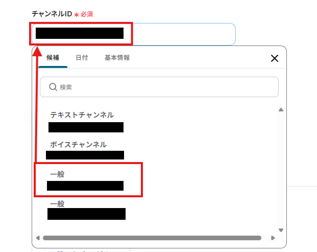 「チャンネルID」は、入力欄をクリックして表示される候補から選択してください。