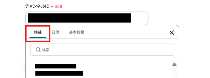 チャンネルID:サーバーIDを入力した後入力欄をクリックすると以下のように候補が表示されるので、その中から選択しましょう。