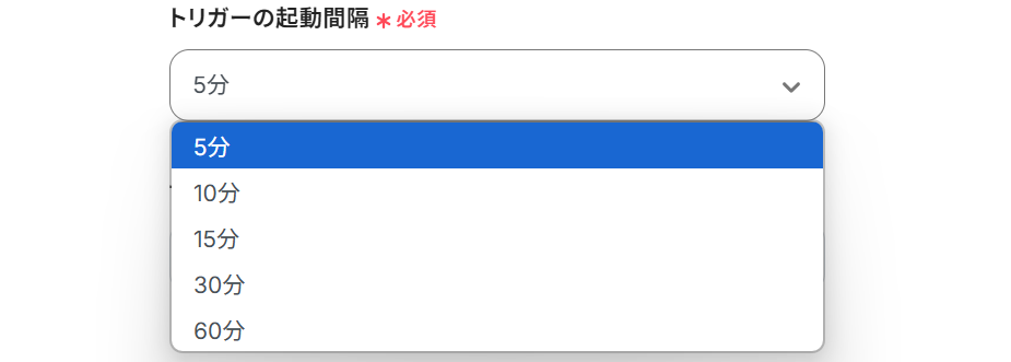 トリガーの起動間隔:5分、10分、15分、30分、60分の中から選べるようになっています。
