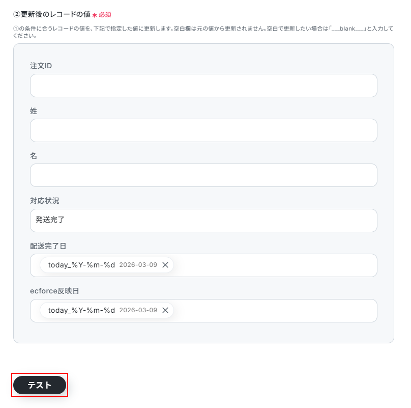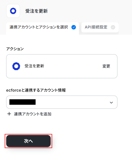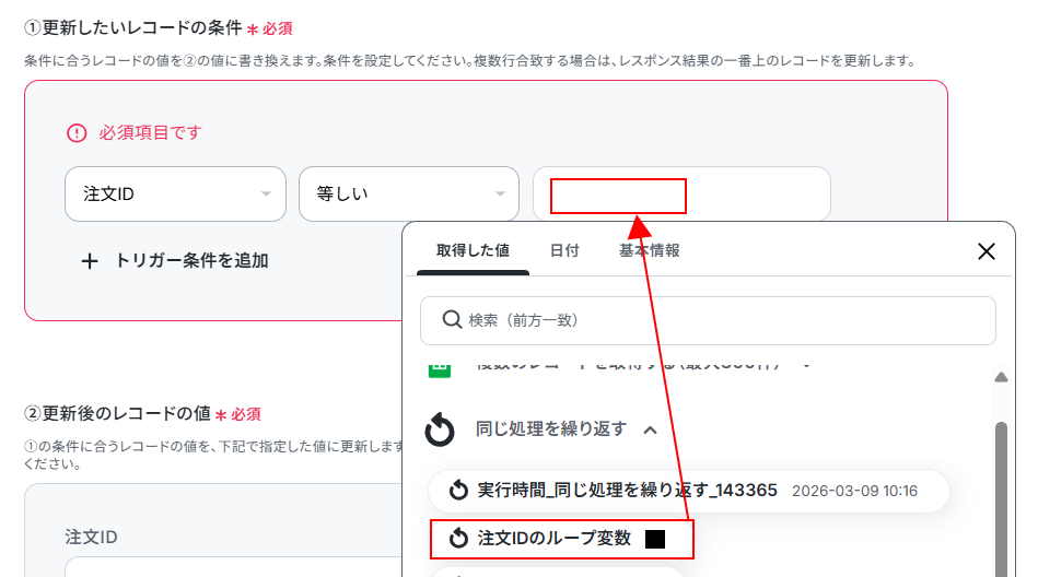 - 繰り返しの処理の中で、ecforceの「受注を更新」アクションを設定します。