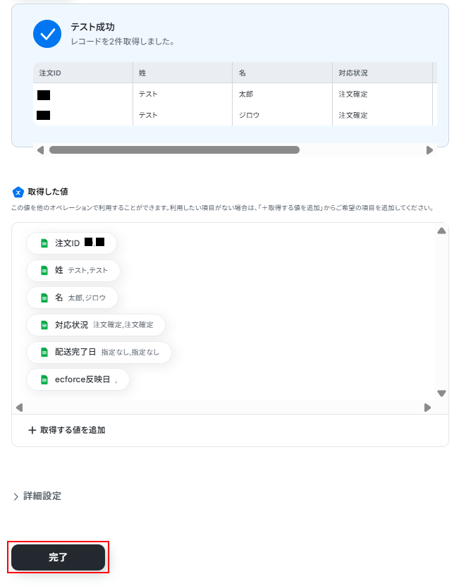 - 続けて、オペレーションでecforceの「定期受注詳細情報を取得」アクションを設定し、解約された受注の詳細データを取得します
