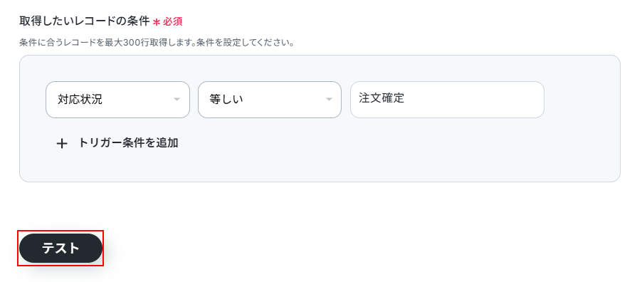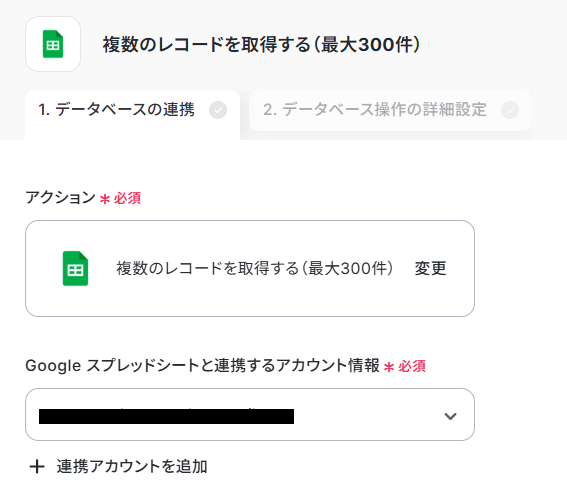- 次に、オペレーションでGoogle スプレッドシートの「複数のレコードを取得する(最大300件)」アクションを設定し、更新対象のデータを取得します。