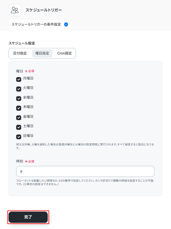 - スケジュールトリガーの設定では、フローボットを実行する時間帯や曜日を任意で設定してください。