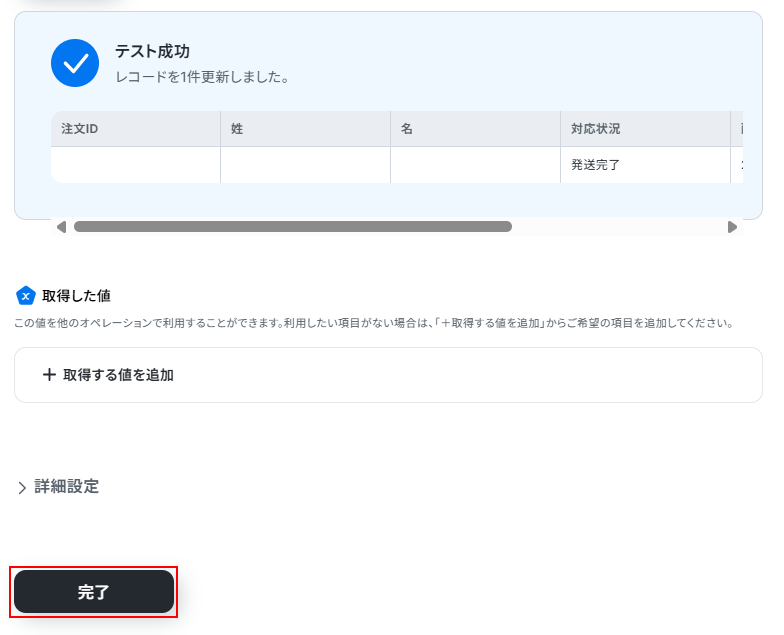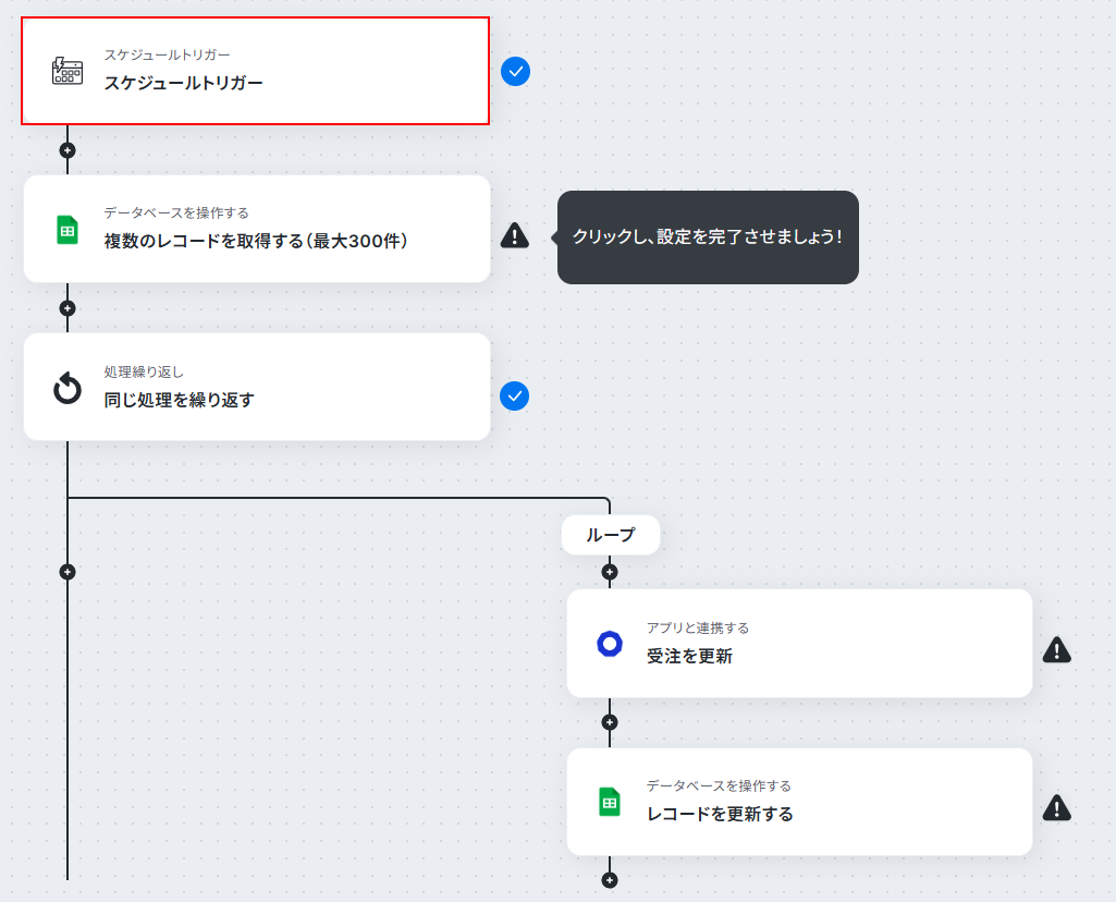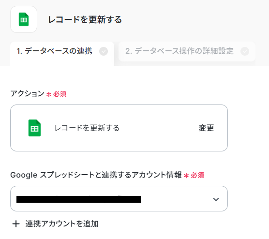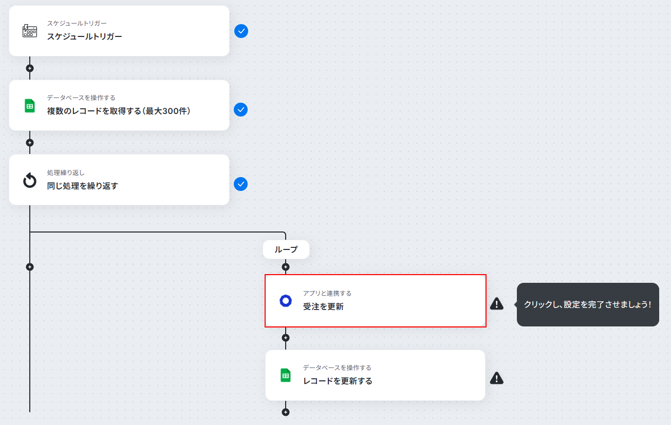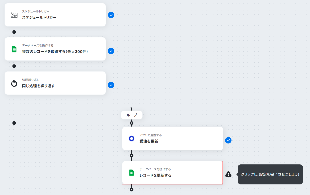 - 最後に、同じく繰り返しの処理の中で、Google スプレッドシートの「レコードを更新する」アクションを設定し、更新が完了したことがわかるようにステータスなどを変更します。