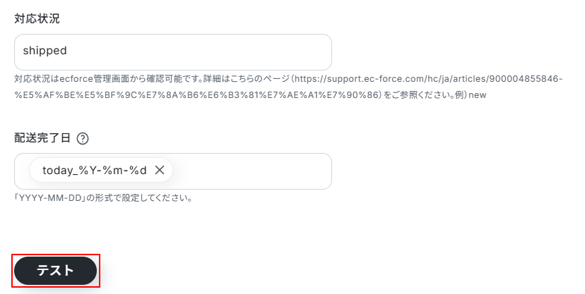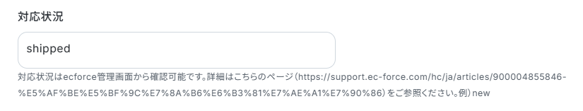- 通知するメッセージの本文は、固定のテキストだけでなく、ecforceで登録された商品名やステータスなどの情報を変数として埋め込み、カスタマイズできます。