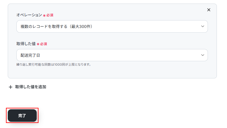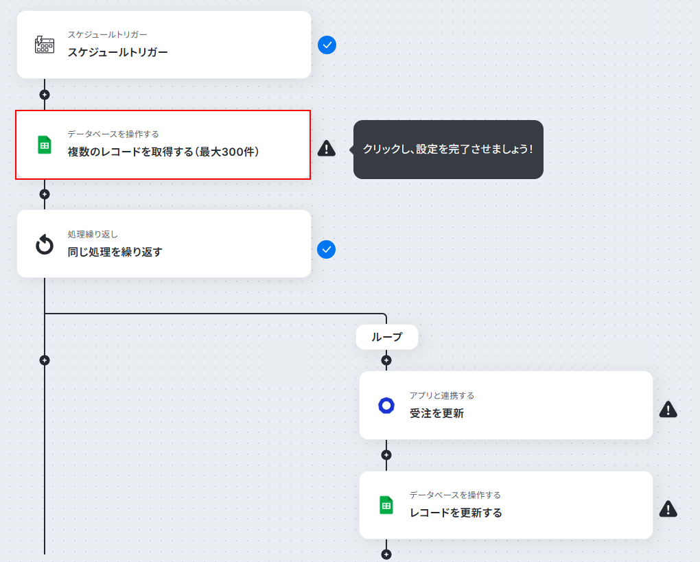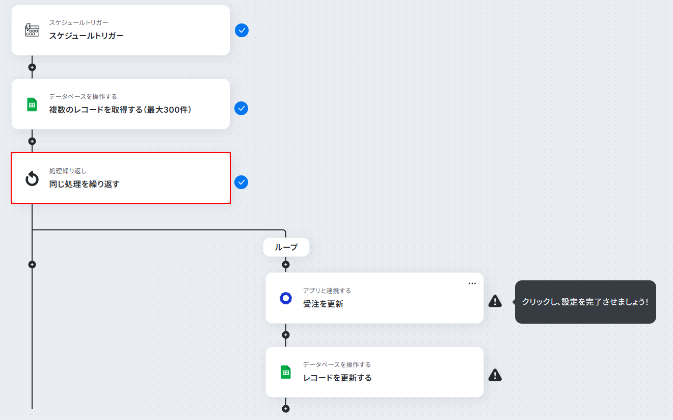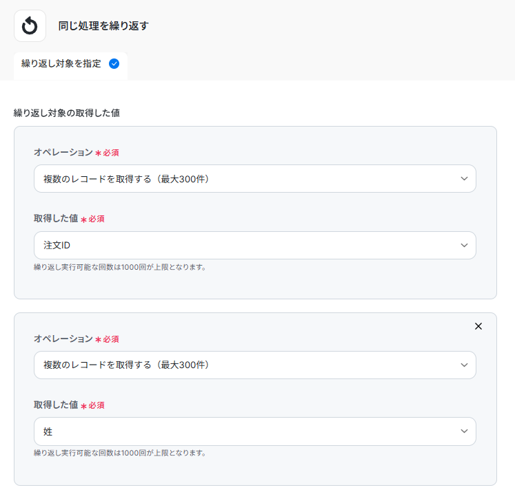 - 次に、繰り返し機能を追加し、取得したレコードを1件ずつ処理するように設定します。